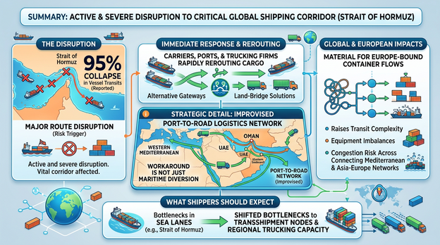 .Summary: A reported 95% collapse in vessel transits through the Strait of Hormuz indicates an active and severe disruption to a critical global shipping corridor, with carriers, ports, and trucking firms rapidly rerouting cargo via alternative gateways and land-bridge solutions.…