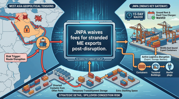 요약: JNPA는 선적 경로를 방해하고 화물 축적을 초래한 진행 중인 서아시아 지정학적 긴장을 이유로 터미널에 좌초된 중동행 수출 컨테이너에 대해 지상 임대료 및 체류 시간에 대한 15일 면제를 도입했습니다. 이 조치는 유럽-아시아 무역로에 연결된 인도의 주요 컨테이너 관문 중 하나에서…