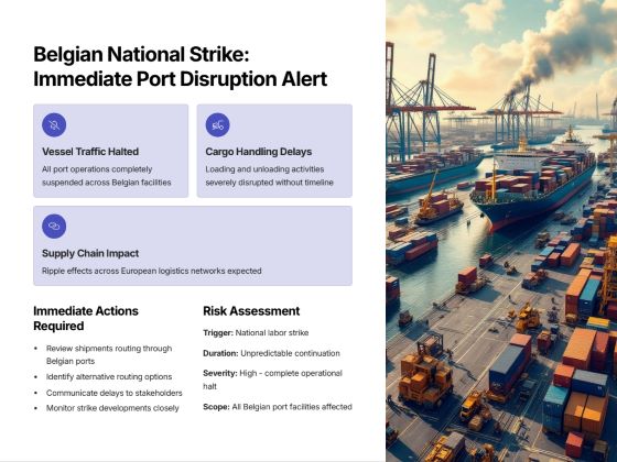 In late November 2025, a national strike in Belgium halted vessel traffic, severely disrupting port and logistics operations. This unforeseen event caused significant delays and pressured logistics managers to adapt strategies. The ongoing strike risks prolonged supply chain inefficiencies with potential financial impacts. URL: https://www.hapag-lloyd.com/en/services-information/offices-localinfo/local-news/2025/11/belgian-national-strike-disrupts-port-operations-and-logistics-c.html