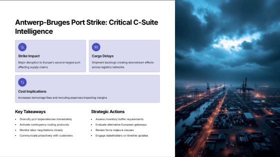 A three-day national strike in late November 2025 at Antwerp-Bruges port caused major cargo delays and congestion, driven by opposition to austerity. Backed by strong unions, disruptions risk extending supply chain challenges and raising logistics costs. Ongoing monitoring is needed to manage impacts. https://www.lloydslist.com/LL1155679/Strikes%20continue%20to%20cause%20congestion%20at%20Antwerp-Bruges?utm_source=search&utm_medium=RSS&utm_term=&utm_campaign=search_rss