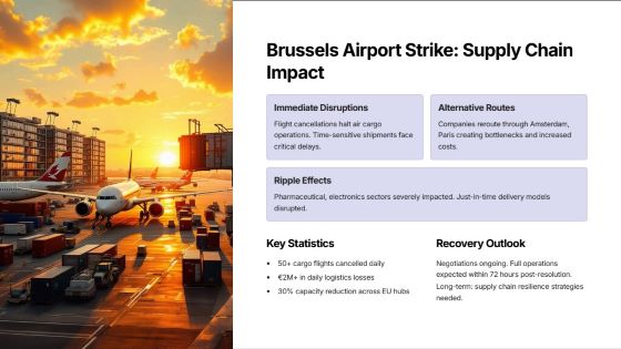 Next Wednesday, a strike at Brussels Airport will halt all departing flights, disrupting air travel and cargo, especially electronics transit. This critical logistics hub faces supply chain risks. The strike highlights the need for risk management but may cause financial losses from delays and cancellations. https://www.hln.be/binnenland/volgende-week-woensdag-vertrekt-er-geen-enkel-vliegtuig-op-brussels-airport-door-staking~a41e664a/